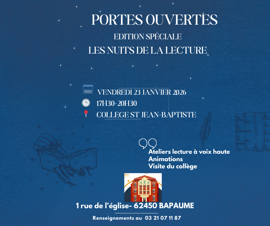 VENDREDI 23 JANVIER 2026 au Collège Saint Jean-Baptiste de Bapaume de 17H30 à 20H30.